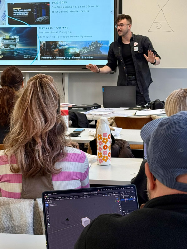 Neben klassischen Themen wie Portfolioarbeit, Typografie oder 3D Rendering ging es auch um sehr persönliche Fragen: „Realitycheck Selbstständigkeit“, „My Higher Self – Design & Future Thinking“ oder „Stoic Design – Selbstmanagement als Gestalter:in“. Viele Angebote wurden von Studierenden und Alumni ehrenamtlich vorbereitet – ein deutliches Zeichen für hohe Identifikation mit dem Fachbereich.